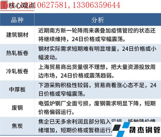 建筑厚壁無縫鋼管:5月23日,全國31個(gè)主要城市20mm三級(jí)抗震螺紋鋼均價(jià)4839元/噸,較上個(gè)交易日下跌10元/噸。短期來看,目前市場(chǎng)供應(yīng)端同比持續(xù)低位,同時(shí)近期南方新一輪降雨來襲疊加疫情管控的狀態(tài)還將繼續(xù)維持,消費(fèi)難有好轉(zhuǎn)預(yù)期。目前市場(chǎng)仍然處于供需雙弱的格局。短期市場(chǎng)關(guān)注點(diǎn)仍在于消費(fèi)能否有效恢復(fù)以及雨季對(duì)于消費(fèi)的影響,因此預(yù)計(jì)24日國內(nèi)建筑厚壁無縫鋼管現(xiàn)貨價(jià)格窄幅震蕩為主。