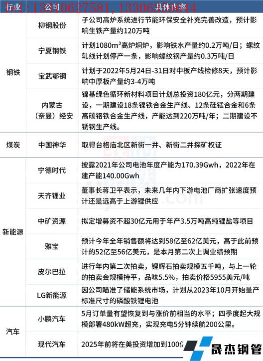5月24日,匯總部分大宗商品相關企業動態。寧夏鋼鐵、寶武鄂鋼宣布檢修計劃,柳鋼股份計劃進行高爐改造;天齊鋰業董事長蔣衛平表示,鋰電行業景氣度高,未來幾年內下游電池廠商擴張速度預計還是遠高于上游鋰供應。具體情況如下: