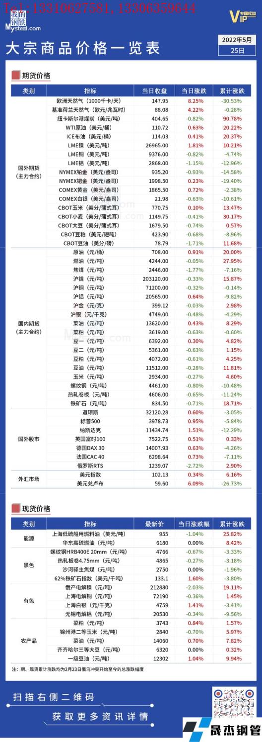 免責聲明:本網站(山東聊城晟杰無縫鋼管廠www.qiazhuo.cn)刊載的“俄烏局勢丨大宗商品價格一覽表(5月25日)”等均源于網絡,版權歸原作者所有,且僅代表原作者觀點,本文所載信息僅供參考。轉載僅為學習與交流之目的,如無意中侵犯您的合法權益,請及時聯系刪除。本網站刊登此篇文章并不意味著本站贊同其觀點或證實其內容的真實性,我們不對其科學性、嚴肅性等作任何形式的保證。如果侵犯了您的版權,請盡快聯系我們予以撤銷,謝謝合作!