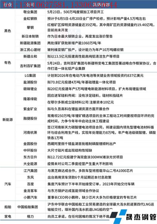 金虹鋼鐵預計于6月5日-6月20日全廠停產檢修,預計影響產量4.5萬噸左右;新疆眾和擬以13.5億元投建高性能高純鋁清潔生產等項目;LG集團計劃到2026年在電動汽車電池等關鍵業務領域投資約837億美元;格力向員工承諾,在任何困難的情況下絕不裁員。具體情況如下:
