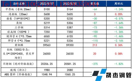 截止2022年5月27日,各原材料當日即時價格以及價格周環比情況如下: