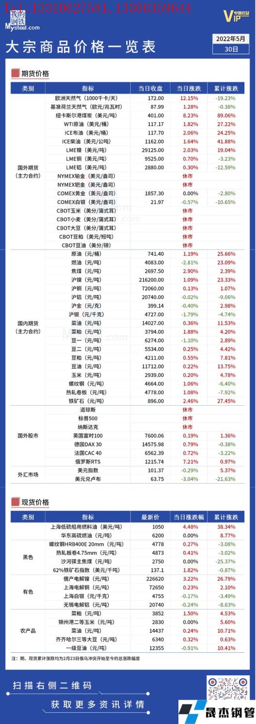 免責聲明:本網站(山東聊城晟杰無縫鋼管廠www.qiazhuo.cn)刊載的“俄烏局勢丨大宗商品價格一覽表(5月30日)”等均源于網絡,版權歸原作者所有,且僅代表原作者觀點,本文所載信息僅供參考。轉載僅為學習與交流之目的,如無意中侵犯您的合法權益,請及時聯系刪除。本網站刊登此篇文章并不意味著本站贊同其觀點或證實其內容的真實性,我們不對其科學性、嚴肅性等作任何形式的保證。如果侵犯了您的版權,請盡快聯系我們予以撤銷,謝謝合作!