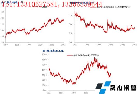 在此次加息周期中,美元、黃金和原油同時上漲,期間漲幅分別達(dá)到8.25%、4.78%和54.12%。其中黃金走勢較為特殊,1999年金價處于歷史低谷,9月26日歐洲15國央行協(xié)議限制黃金拋售量后金價飆漲,隨后金價隨著美元指數(shù)走強(qiáng)而震蕩回落,整體上加息期間小幅上漲。
