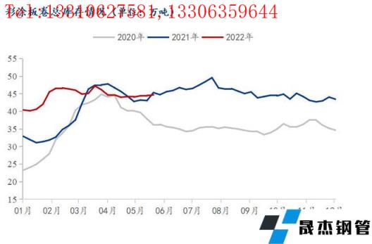 截止到5月底,彩涂板卷社庫28.87萬噸,較上期減少0.16萬噸。彩涂板卷總庫存44.7萬噸,月環(huán)比增加0.48萬噸,年同比減少1.26萬噸。從數(shù)據(jù)上看,2021年5月份以后,彩涂板卷總庫存小幅上升。庫存的上升主要是因為目前下游需求情況不佳,以及部分地區(qū)疫情導致的貨物運輸受阻。