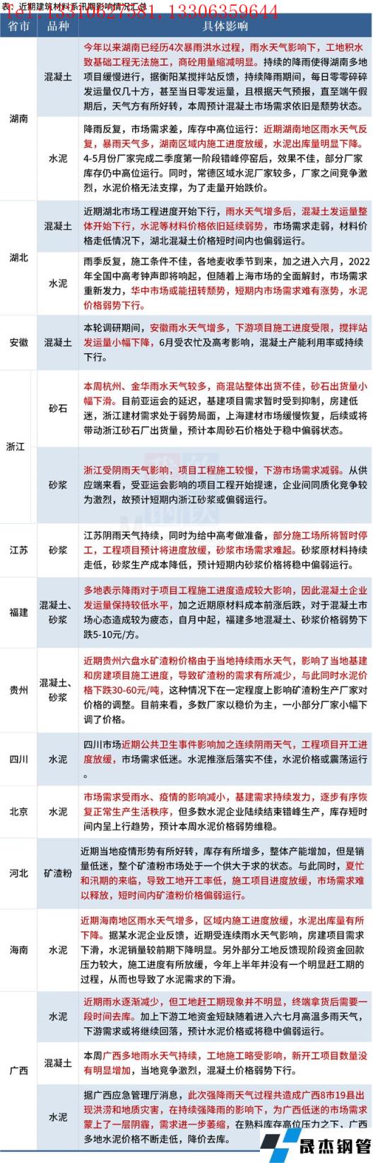 截至6月6日,據百年建筑網調研,華中、華東、西南、華南等12省市建材市場和建筑工地進度受到明顯影響。短期來看隨著部分省份農忙和大規模雨水天氣預報來臨,部分材料整體增量仍然有限,下游市場需求受到一定抑制,市場進入需求淡季,端午節前后價格隨之出現下跌情況。具體情況如下: