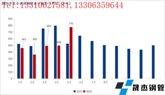 近期我國大部分區(qū)域已經(jīng)開始逐步解除疫情封控,對于前期因疫情導(dǎo)致的運輸受阻基本暢通,因此前期因運輸導(dǎo)致的延遲發(fā)貨在5月份已經(jīng)有所體現(xiàn),預(yù)計6月份仍有部分推遲訂單陸續(xù)發(fā)出,因此6月份我國厚壁無縫鋼管出口或?qū)⒗^續(xù)呈現(xiàn)增勢,由于訂單縮減,7月份起我國厚壁無縫鋼管出口量或?qū)㈤_始逐漸低迷,回歸正常至500萬噸左右的出口量。