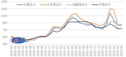 5月份,海外無縫鋼管 厚壁鋼管市場供需形勢得以改善,主要出口國家大幅下調無縫鋼管 厚壁鋼管出口報價。進入6月份,印度加征出口關稅一定程度提振了熱卷價格,各國出口報價基本穩定,云商平臺監測數據顯示,2022年6月8日,印度、土耳其、獨聯體和中國熱軋卷板出口報價(FOB)分別為850美元/噸、820美元/噸、740美元/噸和740美元/噸,與5月底基本持平。