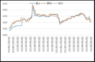 據云商平臺監測數據顯示,截至6月30日,煉鋼生鐵天津地區報價3670元(噸價,下同),較月初跌240元;唐山地區報價3700元,較月初跌230元;翼城地區報價3720元,較月初跌150元;臨沂地區報價3850元,較月初跌180元(詳見圖2)。