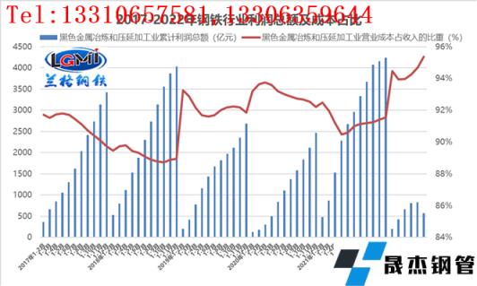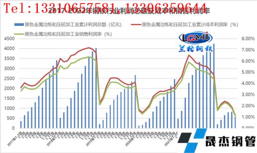 圖3 2017-2022年厚壁無縫鋼管行業利潤總額及成本和銷售利潤率